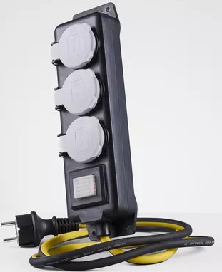 Robust grenuttag med on/off-knapp och synlig gul och svart oljebeständig gummikabel H07RN-F 3G1,5. Försett med hängare för säker placering och enkel åtkomst. IP44-klassat och godkänt för utomhusbruk. 220V, 16A, max 3680 W.